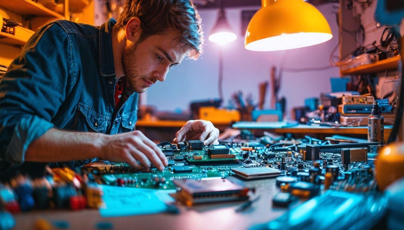 A person in their late 20s examining integrated circuits on a cluttered workbench.